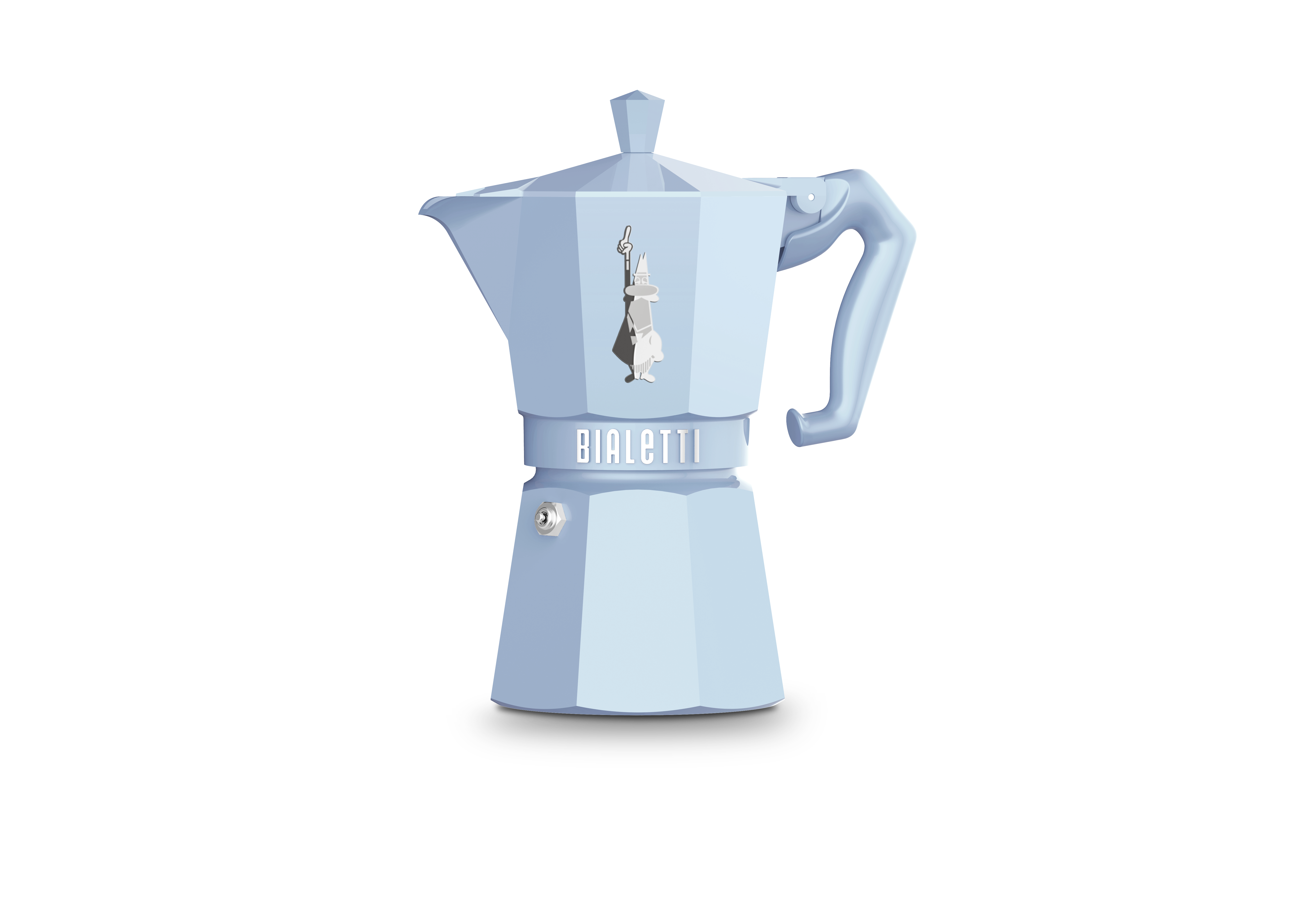 La linea Exlusive di caffettiere moka BIALETTI con i suoi nuovi colori lucidi a effetto smaltato, manico e pomolo colorati in tinta che ricordano gli anni 60. Omino con i baffi pantografato con effetto cromo e la scritta in color argento BIALETTI in rilievo da stampo.