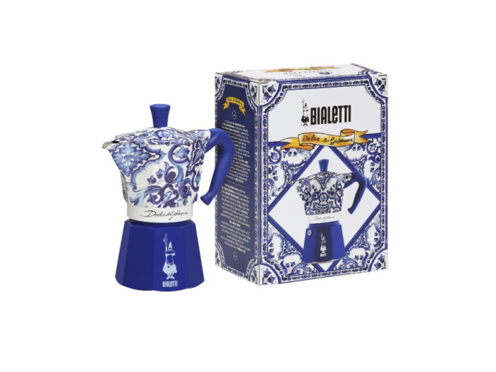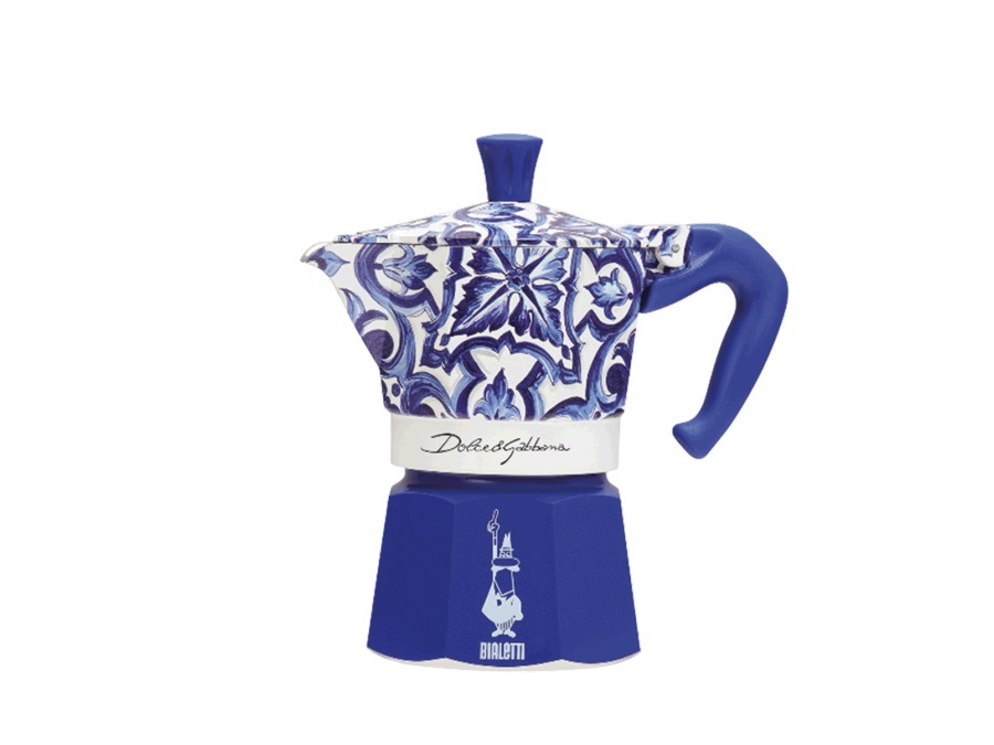 La classica caffettiera Moka da tre tazze di Bialetti nella nuova ed esclusiva versione di Dolce e Gabbana che ricorda i paesaggi e il blu intenso del nostro Mediterraneo.