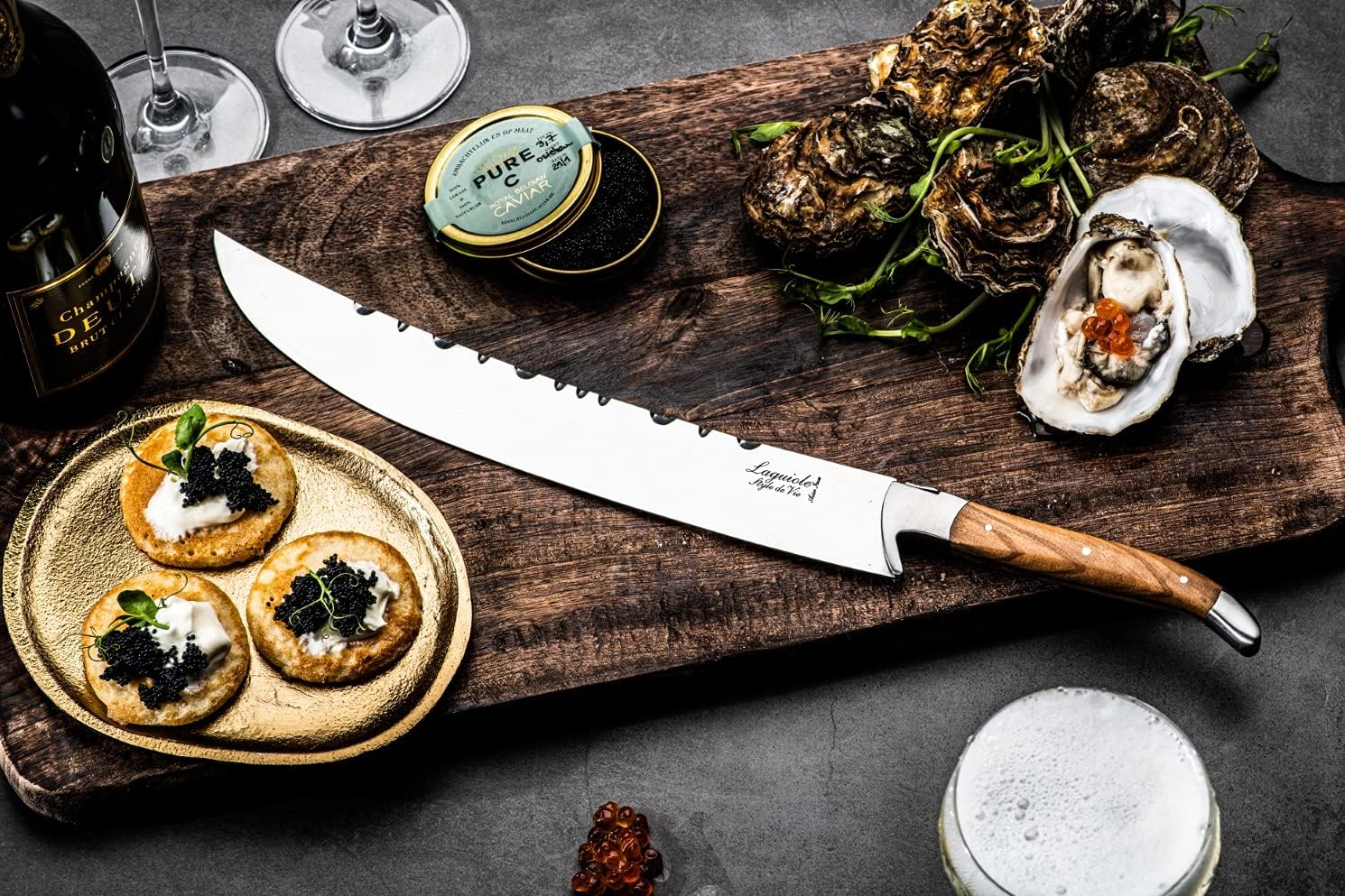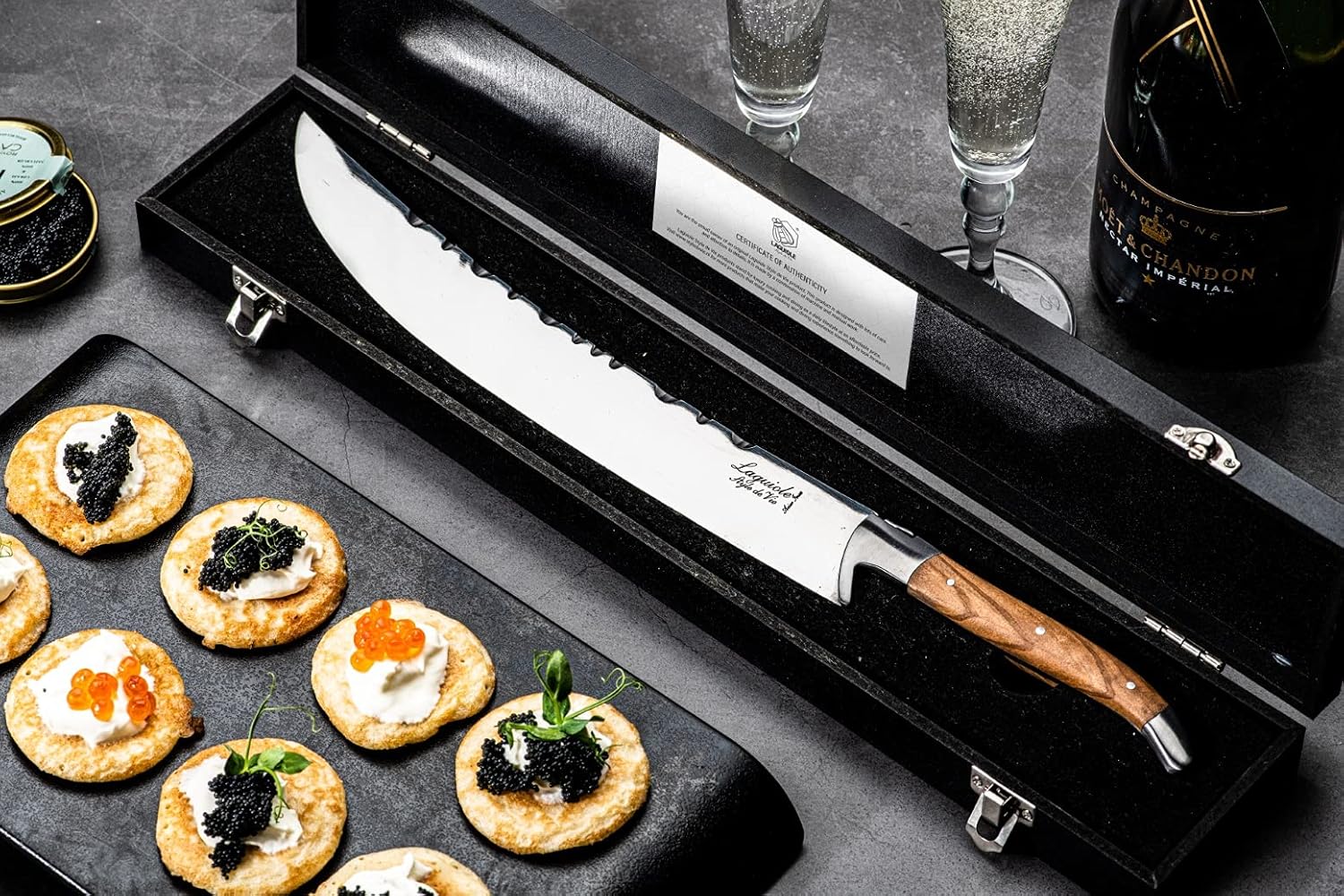 Anche la confezione da regalo è curata ed elegante. La sciabola per lo champagne Laguiole è anche dotata di una scatola in legno per poterla riporre senza il rischio di rovinarla.