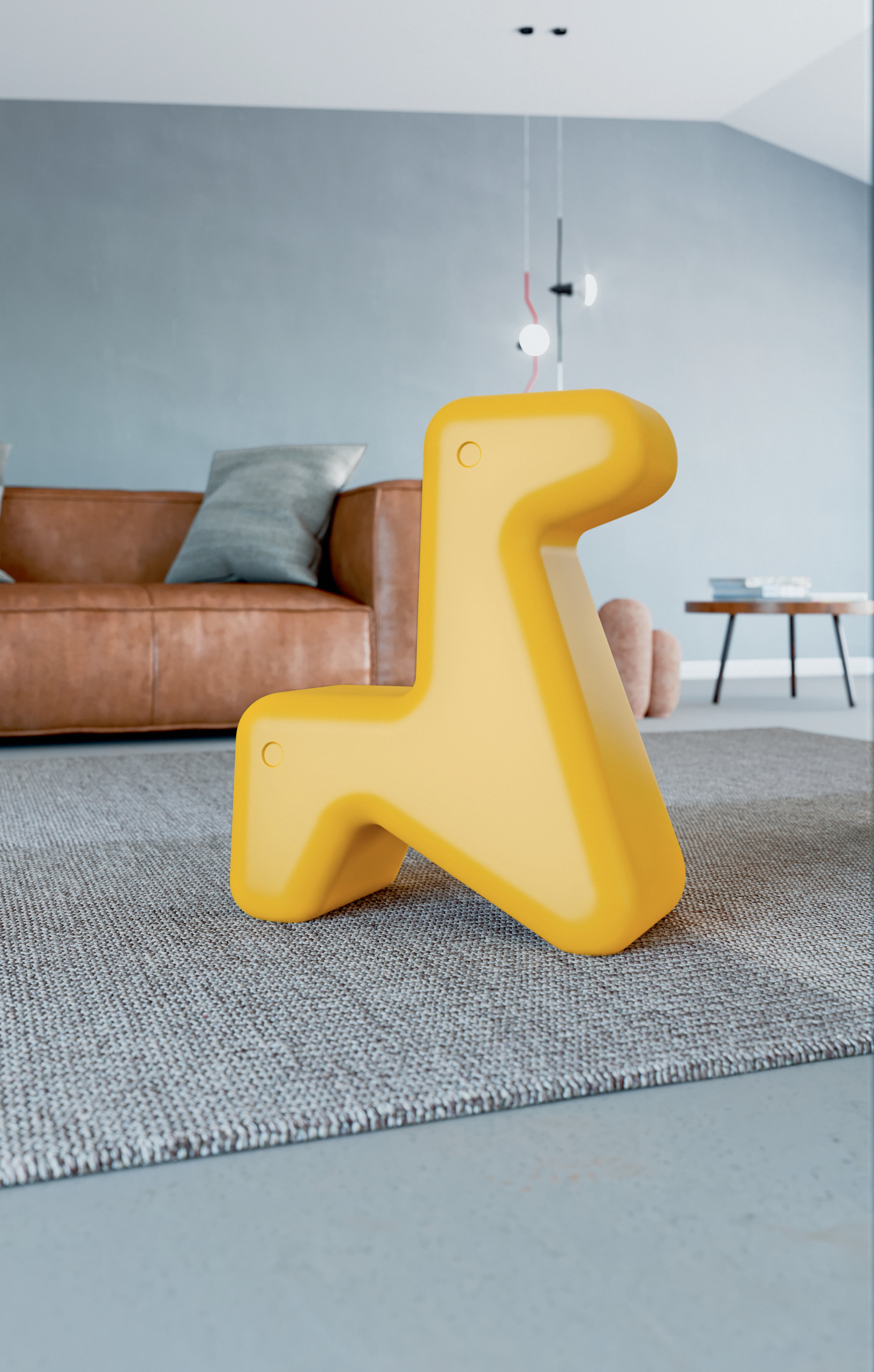Nell’altra posizione, richiama la forma stilizzata di un cane sul quale il bambino può sedersi usando la parte corrispondente alla testa come un piano su cui giocare, disegnare, pranzare o fare merenda.