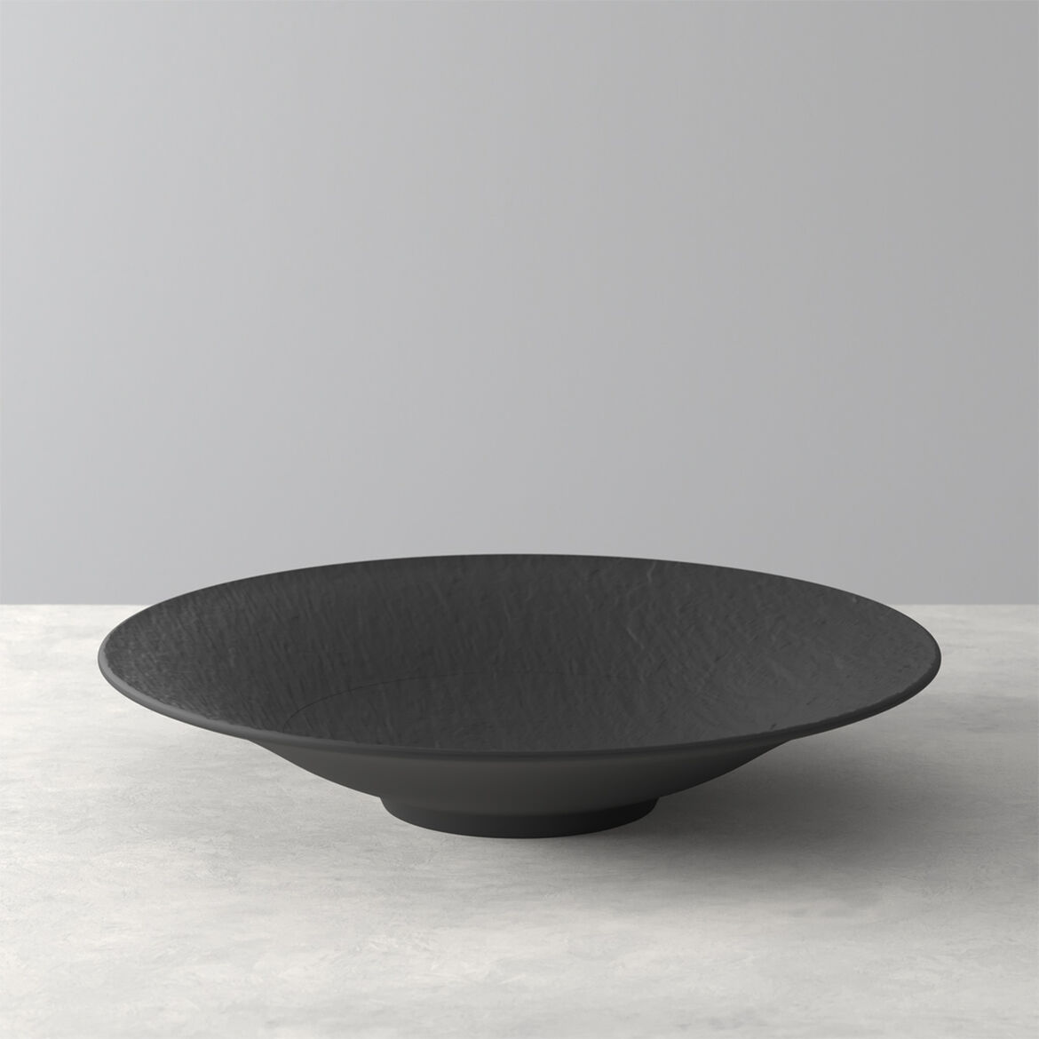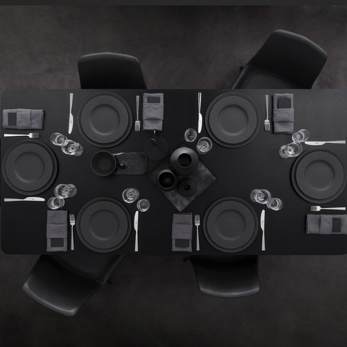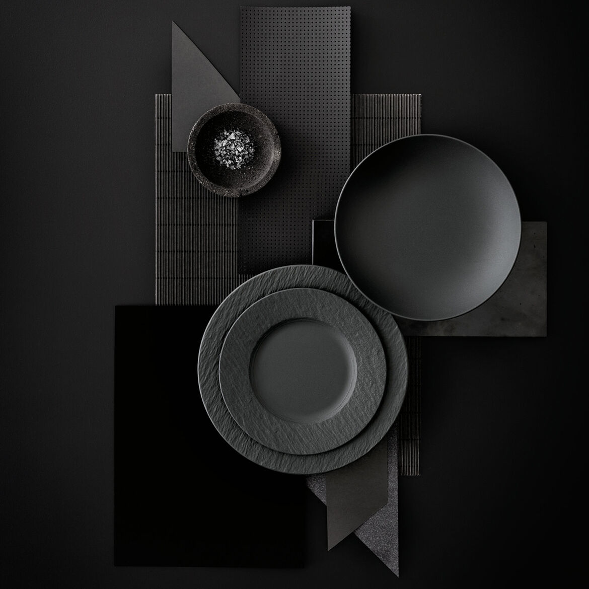 La linea Manufacture Rock nero ha un aspetto estetico opacizzato e, grazie alla sua particolare decorazione in rilievo, ricorda l’ardesia. In realtà è composto dalla porcella che si trova nei servizi più classici, lucidi, storici e continuativi di Villeroy & Boch.