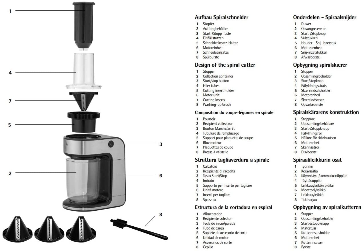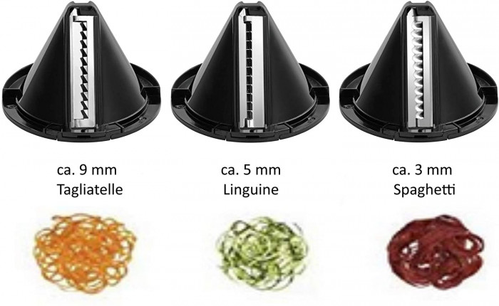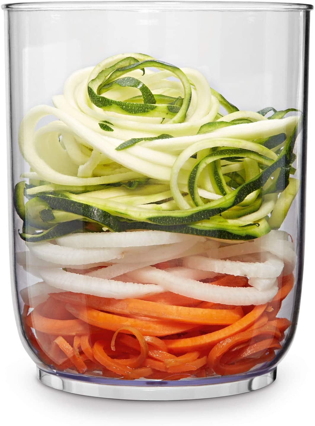 Numero di pezzi inclusi: 5 pezzi. Spiralizer elettrico, contenitore da 1,25 Lt. e 3 inserti da taglio